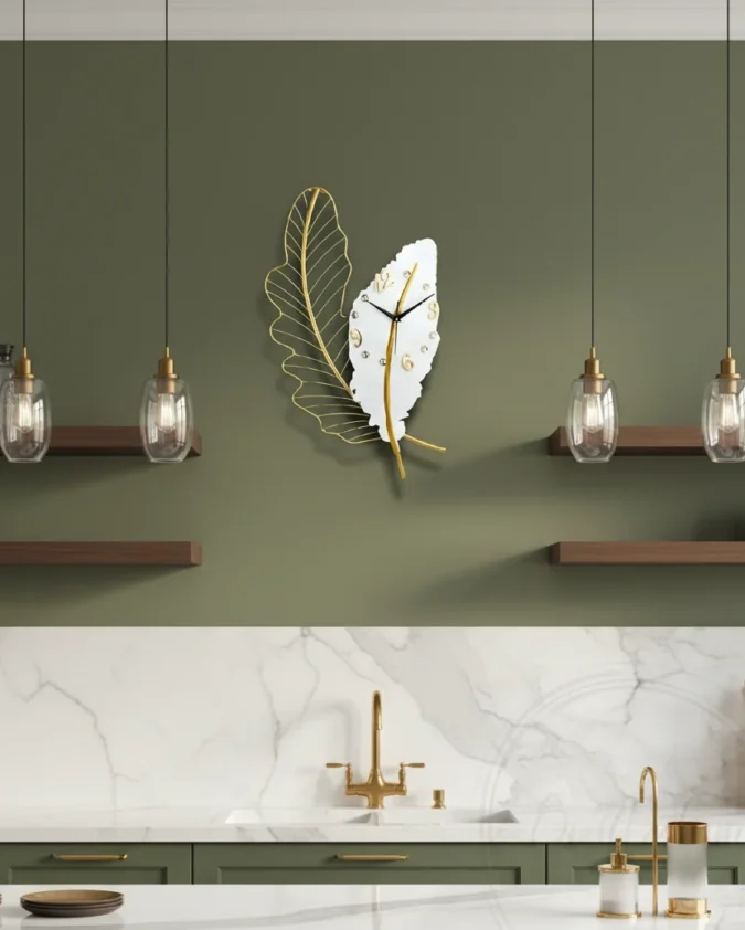₹1,999.00A luxurious leaf-inspired MDF wall clock combining gold and white tones — perfect for adding sophistication and style to any wall décor.
