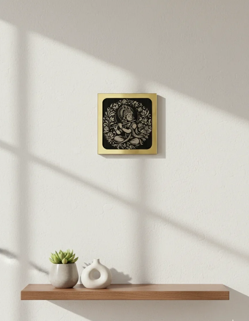 Bring home the essence of divinity and elegance with this beautifully crafted wooden art piece featuring Lord Krishna playing the flute, surrounded by intricate floral patterns. Made with fine laser-cut detailing, this artwork is designed to add charm and positivity to your living space.