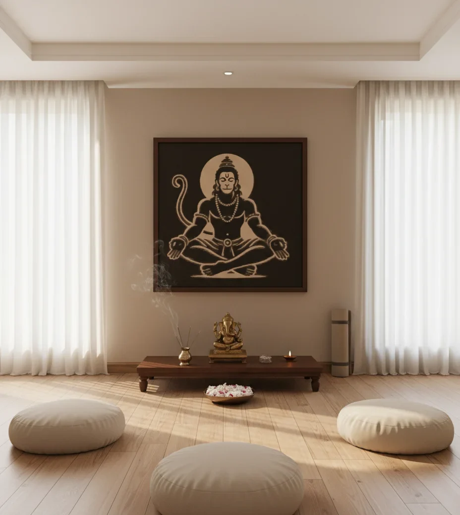Design: The art piece features a striking, contemporary interpretation of Lord Hanuman, capturing his calm, meditative pose. The clean lines and neutral tones make it versatile and fitting for any modern or traditional interior.