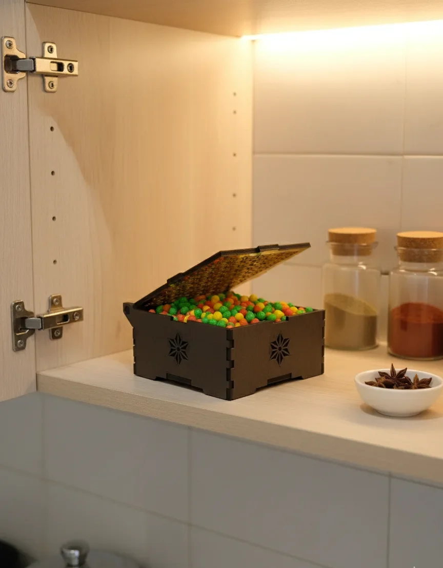 The sleek, decorative MDF box not only keeps the mouth freshener fresh and flavorful, but also serves as a charming tabletop accessory for your kitchen, dining room, or office.
