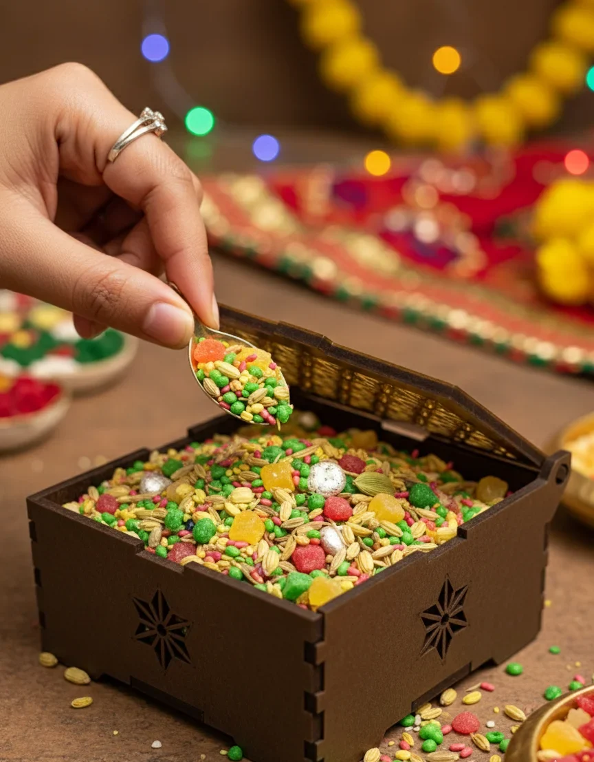 Elevate your post-meal experience with our Premium Mouth Freshener, beautifully presented in a handcrafted MDF wooden box. Bursting with vibrant colors and rich in flavor, this carefully curated blend combines aromatic fennel seeds, sugar-coated candies, and traditional Indian ingredients to refresh your palate and aid digestion.